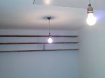 So, here’s some piccies: lights in. Sink’s in. Cheap spruce ply, cut, sanded, waxed then varnished.